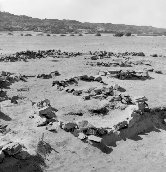 Initially, 11 graves were excavated in January 1965 (by A.J. Mills). Subsequently the site was fully excavated during February 1965 (by H.-Å. Nordström). Surface clearance identified the presence of at least 69 graves. Only about half of the heavily disturbed burials, many of which contained no traces of the original burials, were more fully recorded. Where burials survived most of these were contracted, lying on the right side, head to east. Most graves were more or less orientated east-west, mostly quite small and oval, if of variable depth, some deep. Leather pillows seem to have been used in some of the graves, but no traces of other body wrappings were found. The pottery from this site was identified as ‘Early C-Group’ and no later C-Group/Kerma material was found. Several more-or-less complete RP-BT bowls were recovered from disturbed grave fills while a few were found, inverted, on the ground surface beside the grave superstructures.