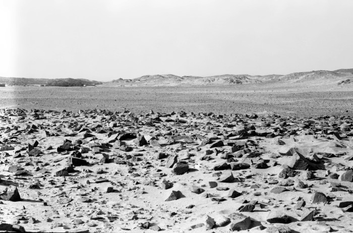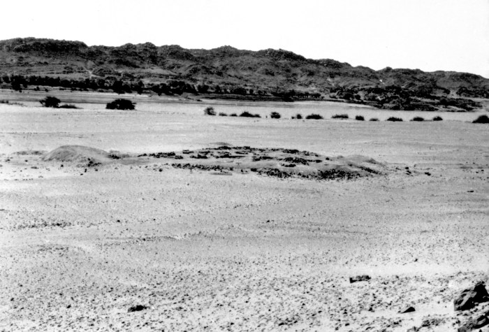 Cemetery [11-H-5] was located on a small rise of fossil alluvium in the broad alluvial plain at the north end of Saras West, c.350m from the river bank. It was identified in January 1965. The surface was sanded over with c.25-30 cm of blown sand, littered with black boulder stones (‘black mica schist’), suggestive of circular superstructures c.2-3m in diameter. In some areas there was many small, smooth white pebbles of the type also found on graves of this period.