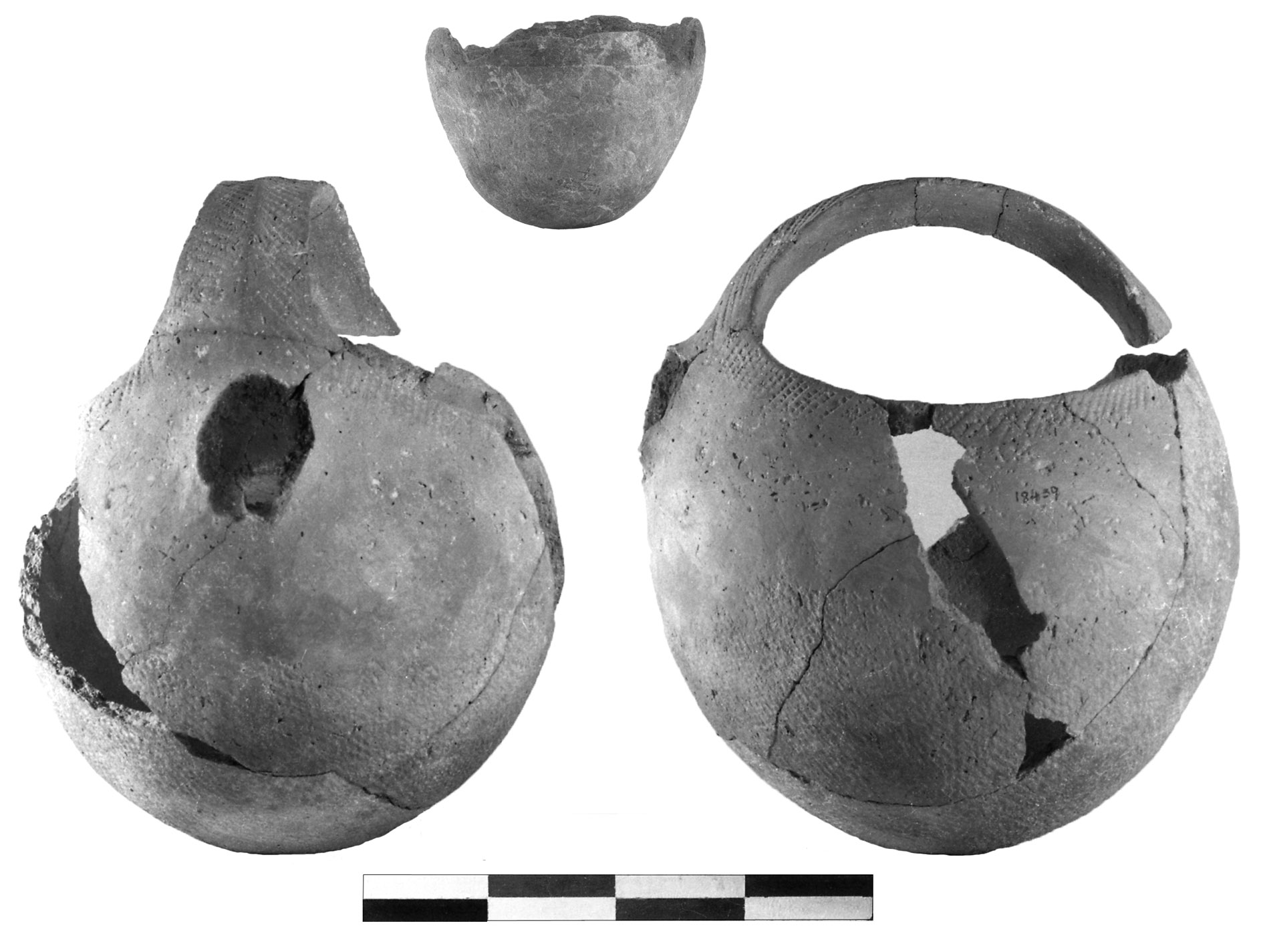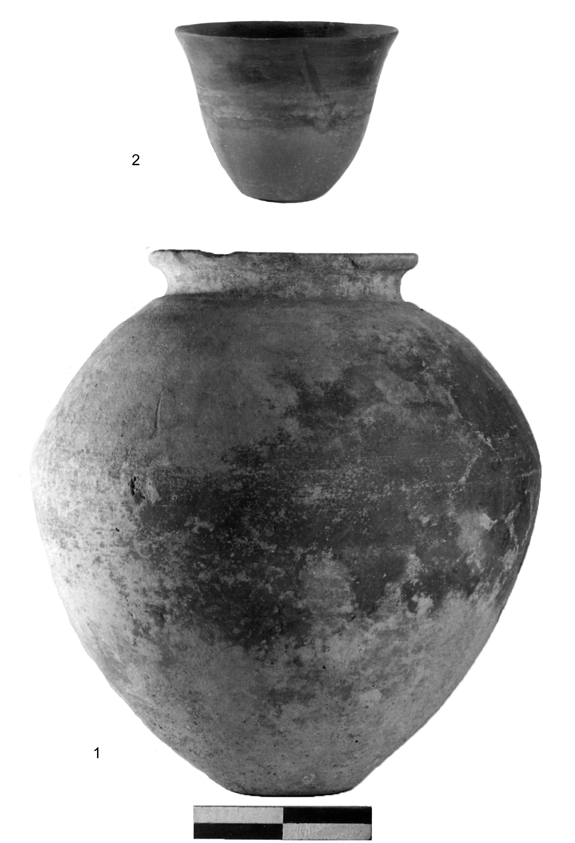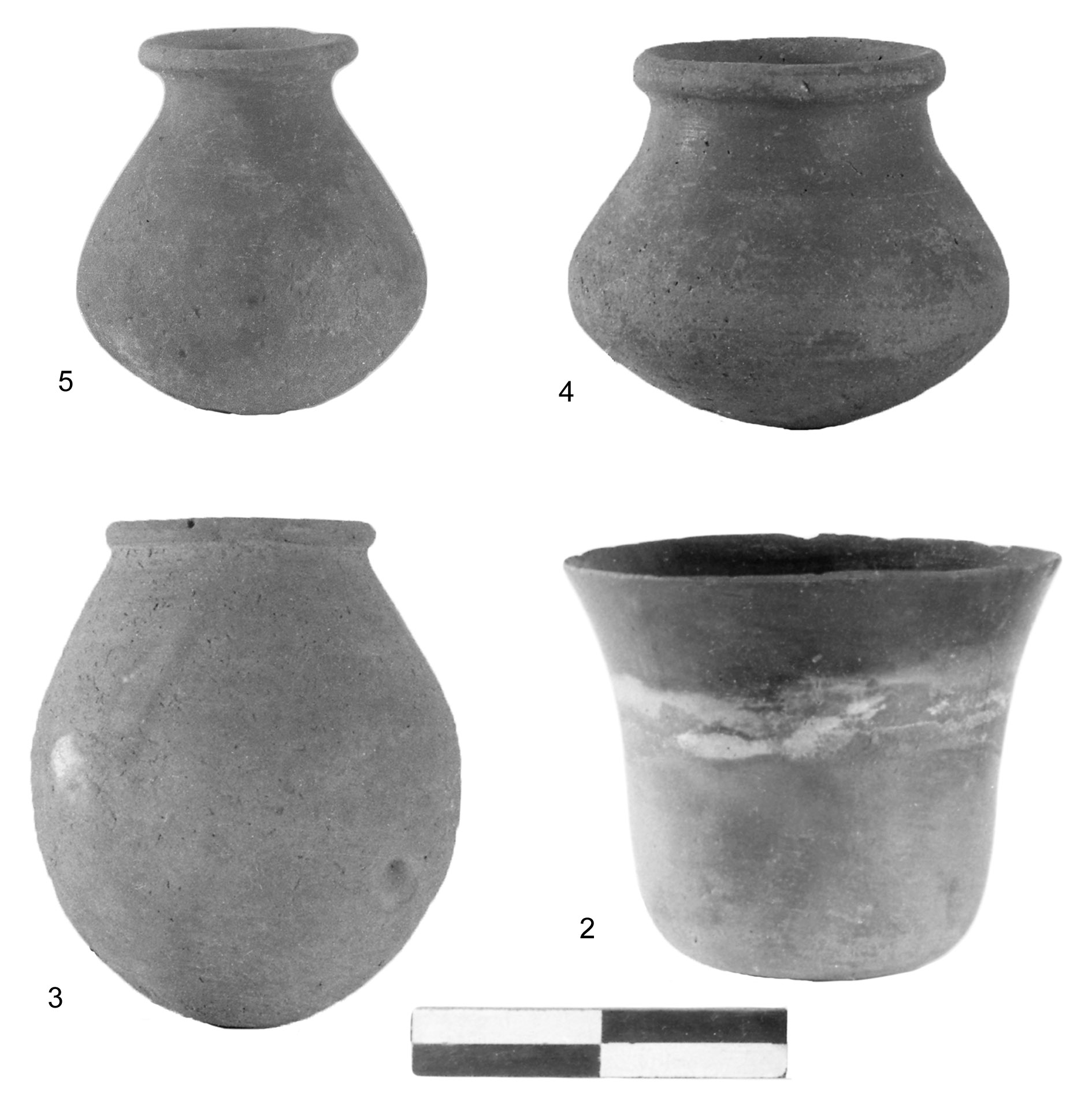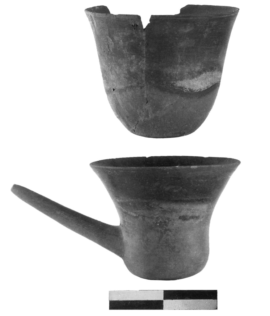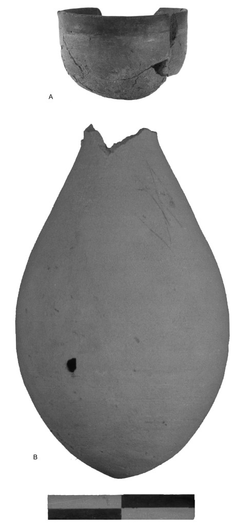 This was a large (plundered) cemetery c.600m from the river near the village of Maasho, on the edge of the Saras plain. Two areas were tested and 24 graves excavated in November 1965, providing an estimated 25% sample of the whole site which may have held c.320 graves, some identified as ‘C-Group’ and the majority as ‘Kerma’, including some typical Classic Kerma burials with bed burials. A preliminary note on the site was published in Kush (Mills 1973: 203-205). Some of the groups of more complete pots and some other finds recovered from different graves are illustrated below.