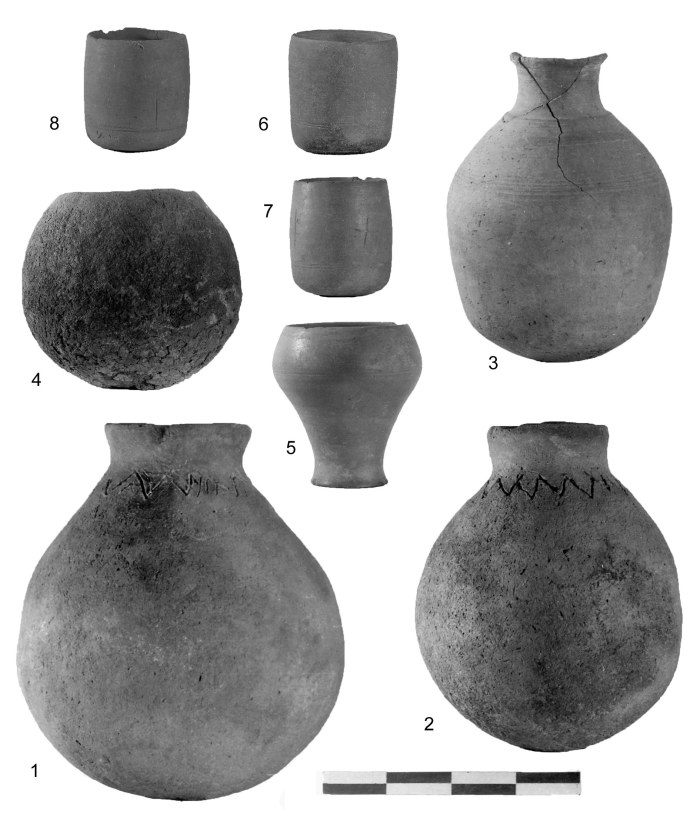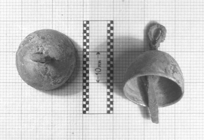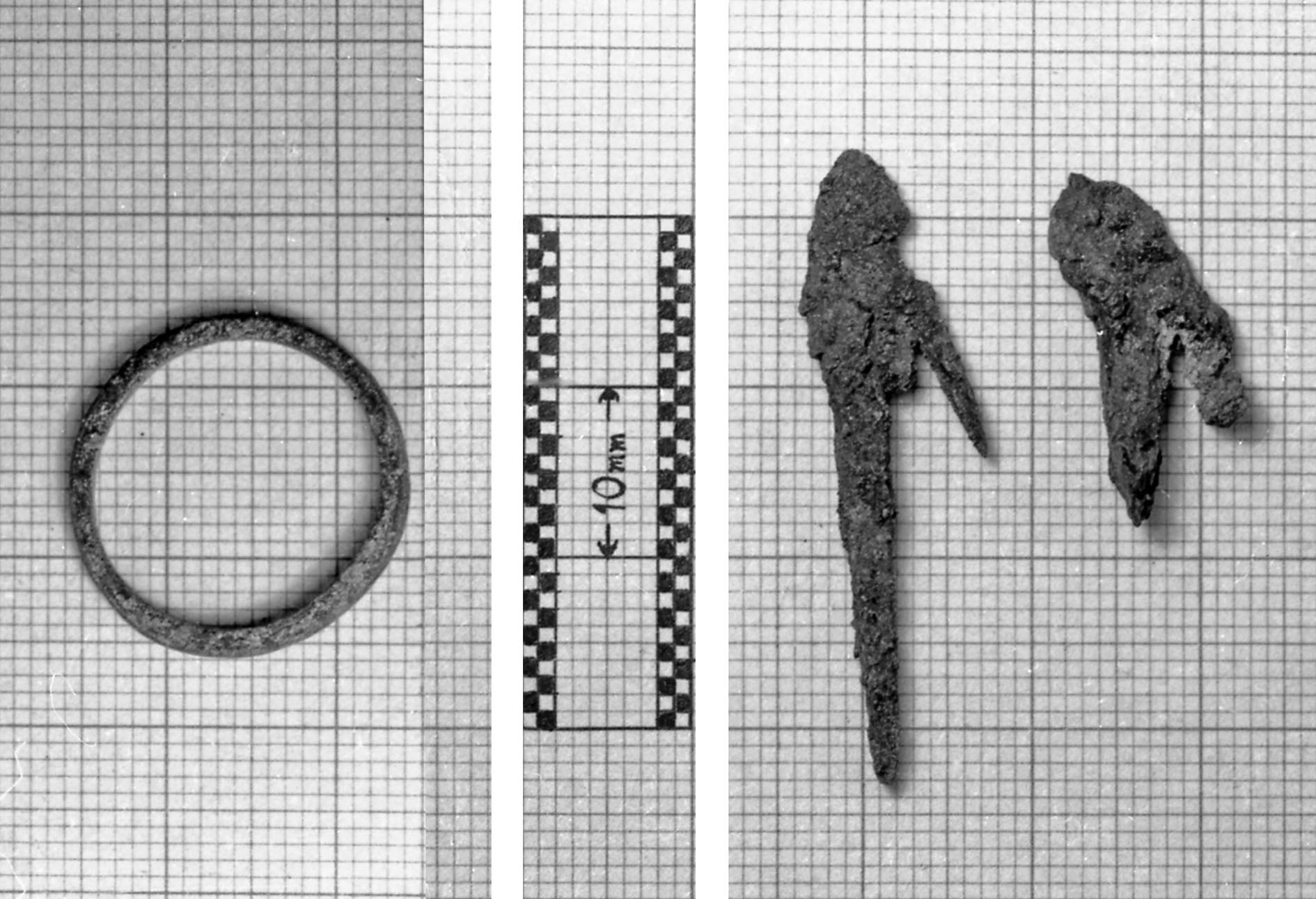 Grave 3 also contained a range of pottery as well as a metal bell and arrow heads; the decayed remains of what may have been a leather quiver, and a bow-string may indicate the presence of other archery equipment, not uncommon in this period. Small silver rings were found in both these graves.