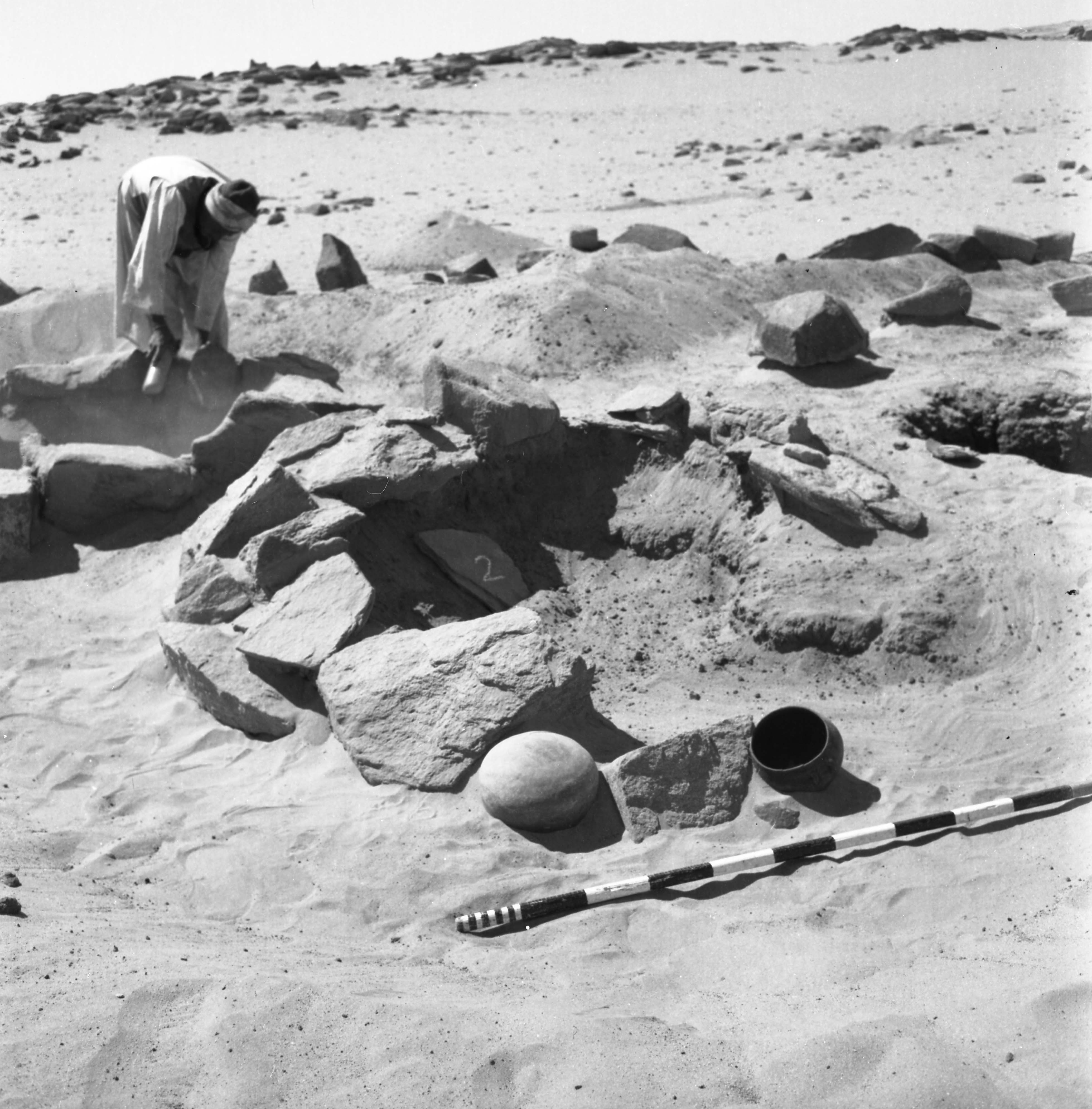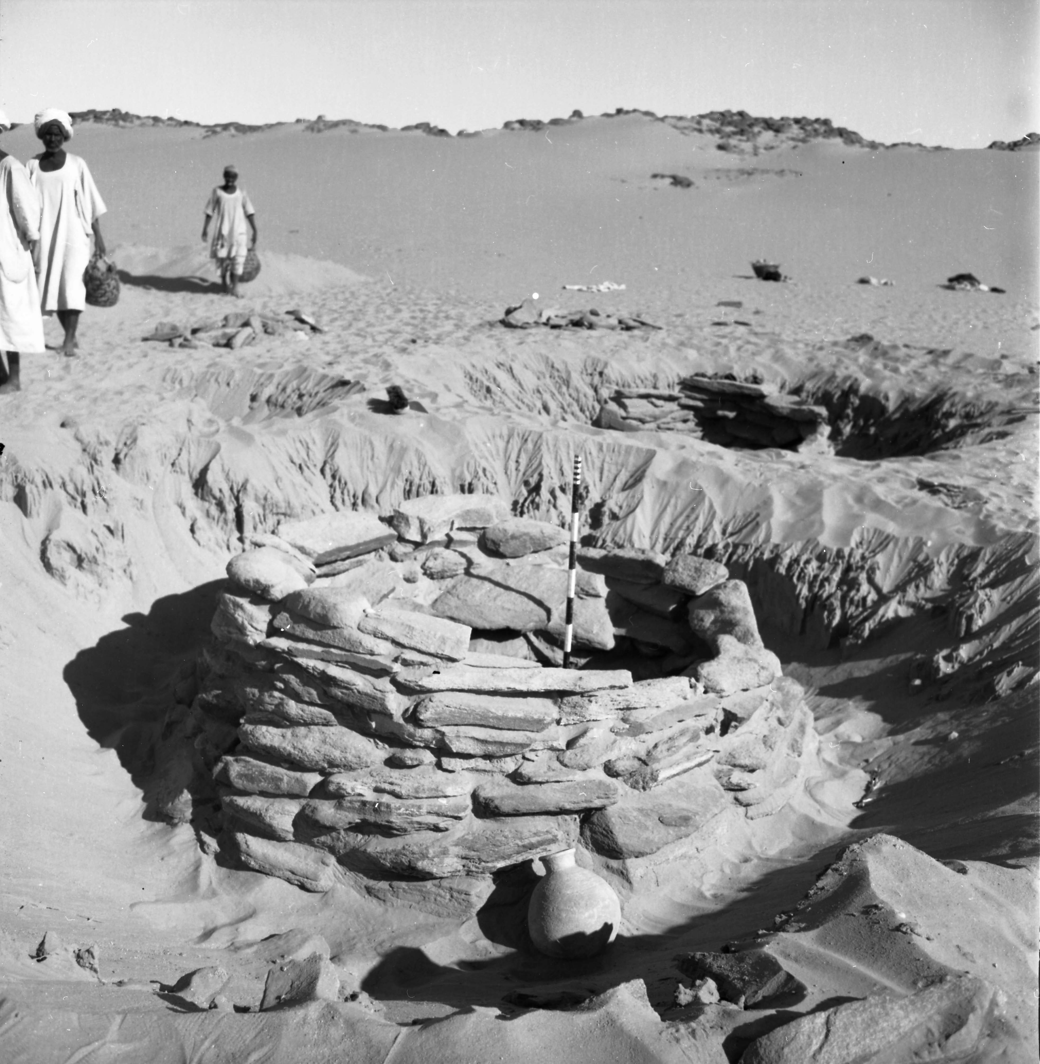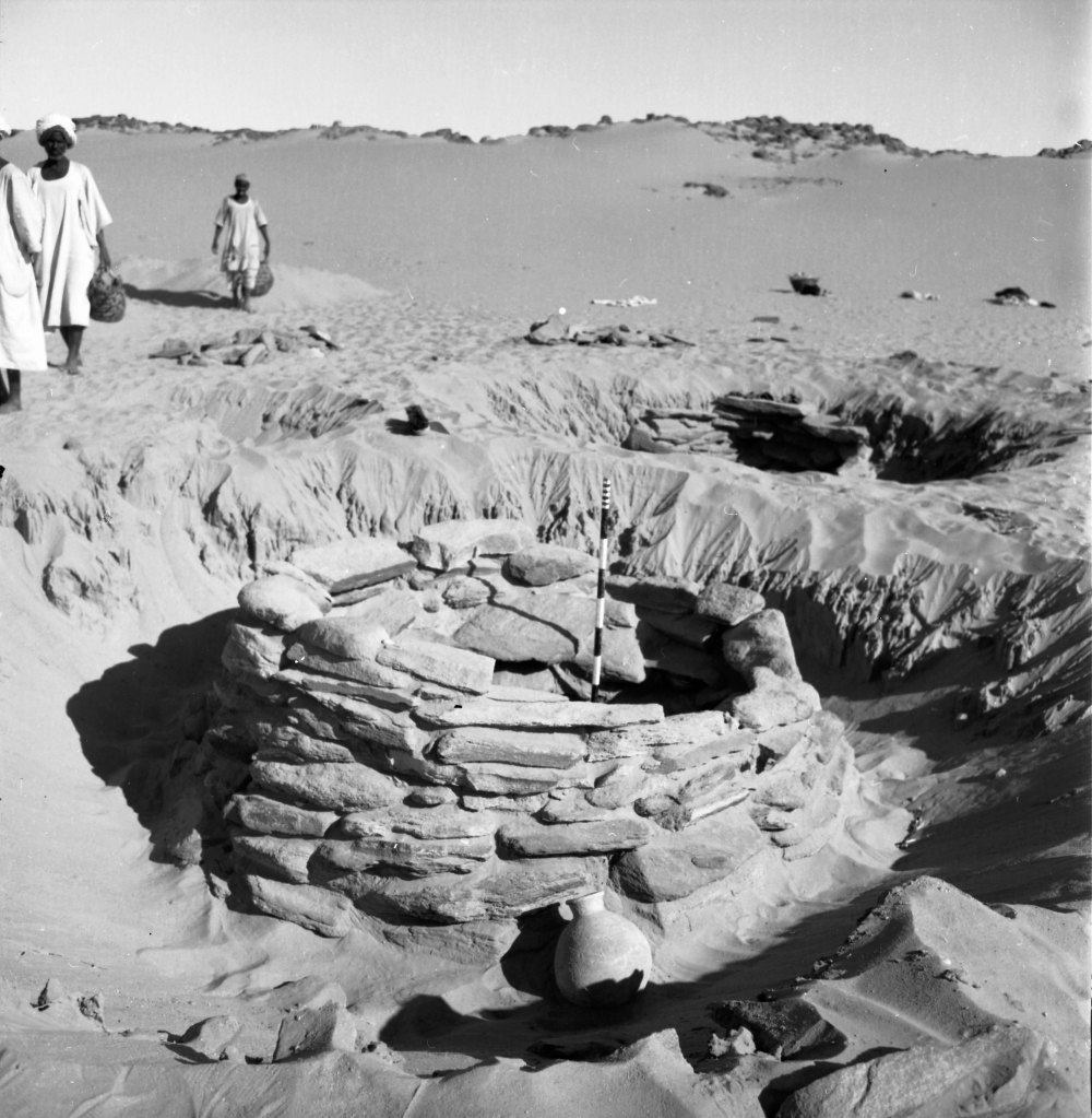 This small cemetery lay on a heavily sanded terrace on the side of a large wadi that reachs the river near the upstream end of Tangur island, c.300m from the river bank. A campsite [15-Y-24] lay closeby on the south side of this outcrop. The location probably survives above modern water levels. Test excavations in 1968 revealed 16 graves, in two clusters, but there may have been others more deeply buried in blown sand. In the cleared areas surface cover of blown yellow sand was generally 40-70cm deep. The blown sand covered an ancient surface of fossil alluvium which was the level at which the graves were cut; the accumulations of sand post-dating the burials. The very good preservation of some of the grave superstructures, as well as the survival of several intact pots deposited beside them suggests that wind-blown sand may have begun to accumulate in this area at an early date.