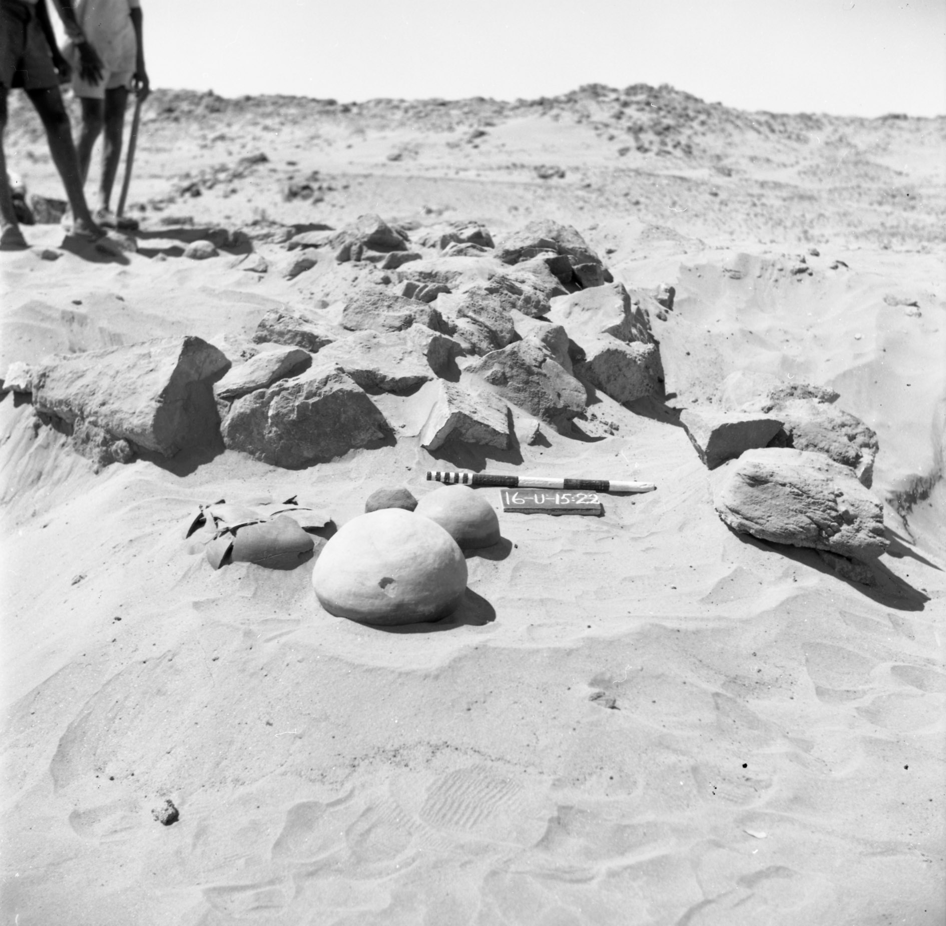 The surface was covered with a quite thick layer of sand and large stones from collapsed grave superstructures. The graves were generally rectangular pits with an east-west orientation, but with some circular pits. All the excavated graves had been robbed and few finds or human bones were recovered from the disturbed grave shafts. The few skeletal elements found in situ suggested most burials were placed on their right sides, head east, facing north. In some cases pots were found on the surface beside the superstructures.