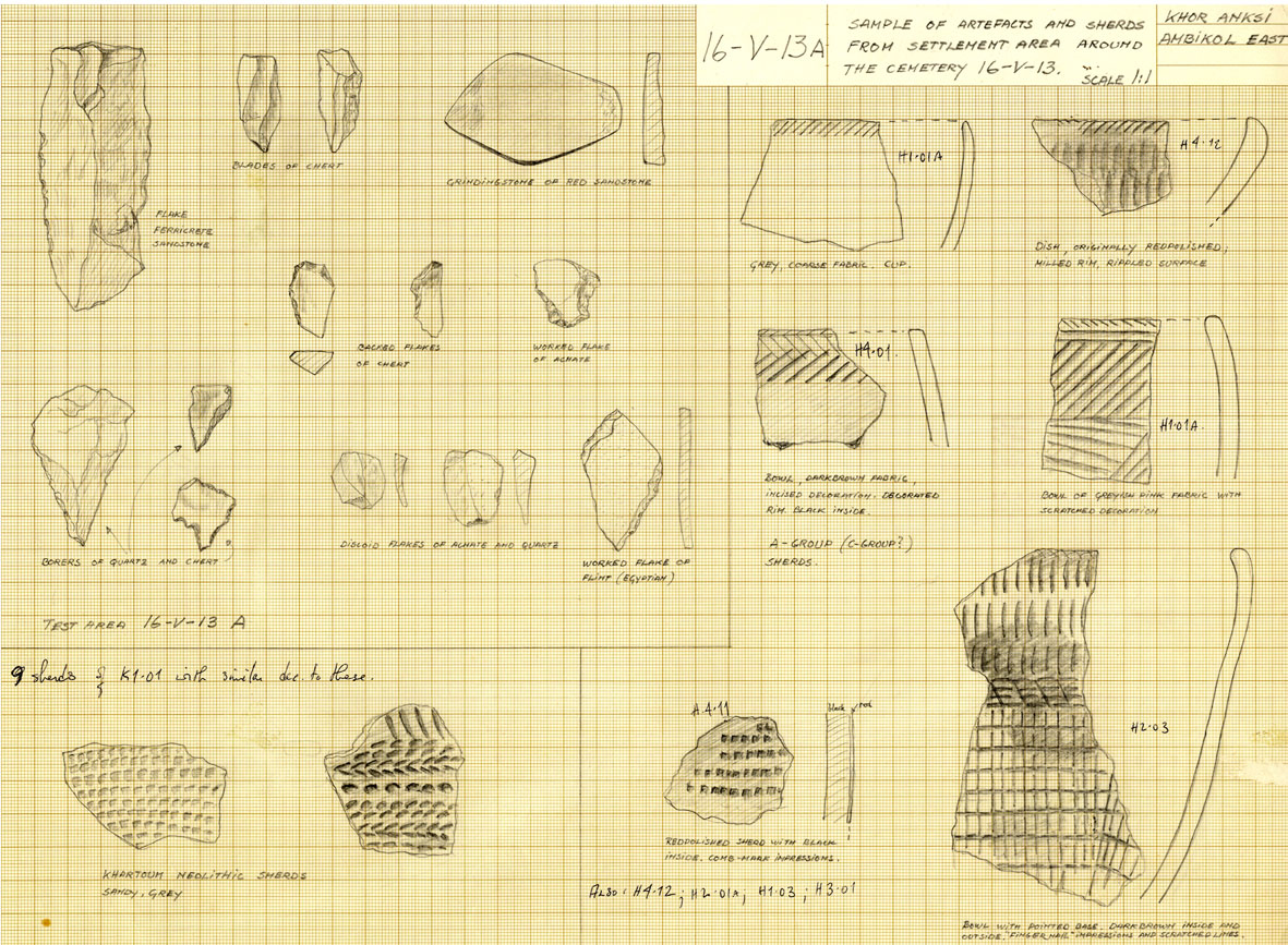 This site lay c.400m from the river bank, c.1km east of the village of Nerri, on a hilltop immediately west of the Khor Anksi. The site was a cemetery of c.21 graves and at least one storage pit (with medieval pottery) within an area of c.25m x 15m. This was on a flat jebel plateau, recorded as 29.2m above Nile level in February 1968. The hillside slopes were quite steep to north, east and south, to the west the jebel ridge continued rising into the high hinterland. This hilltop overlooked the Khor Anksi; another ‘C-Group’ cemetery [16-V-14] lying opposite on the east bank of the wadi. It was fully excavated by Bengt Schonback in early February 1968. It ws registered as a ‘C-Group’ site.