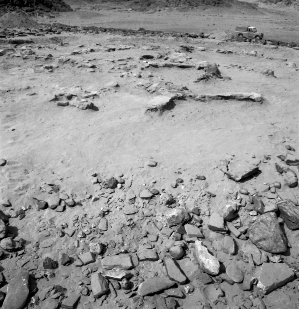 A test excavation examined an area of c.10.5m x 11.5m in January 1968, undertaken by A. J. Mills. The ‘fill’ apparently all represented one level of occupation, surviving to a depth of no more than 30cm containing sherds and quartzite pieces. There were remains of some structures on the site; in the tested areas consisting of a number of walls of rough local stone, set in and possibly plastered with mud. Very eroded these suggest a series of adjoining rooms, not necessarily connected. In plan these seemed irregular in shape and size. Their date was uncertain but, on the basis of the predominance of ‘Khartoum Variant’ material (almost entirely Ware K1.01), potentially associated with that period. The nature of the site remained uncertain. The large number of quartzite flakes and the proximity of a large quartzite outcrop suggest a ‘tool industry’ here. However, there were found in the tested area a fair number of smooth oval rubbing stones, and in the same area a powdery white deposit, in a considerable quantity. A further puzzle at the site was that, despite the abundance of chipped quartzite pieces, nothing resembling a stone blade was seen (nor anything resembling lithics found by Arkell), nor any fragments of bone or horn. The only ‘tools’ seen were the c.30 pounder/grind stones.